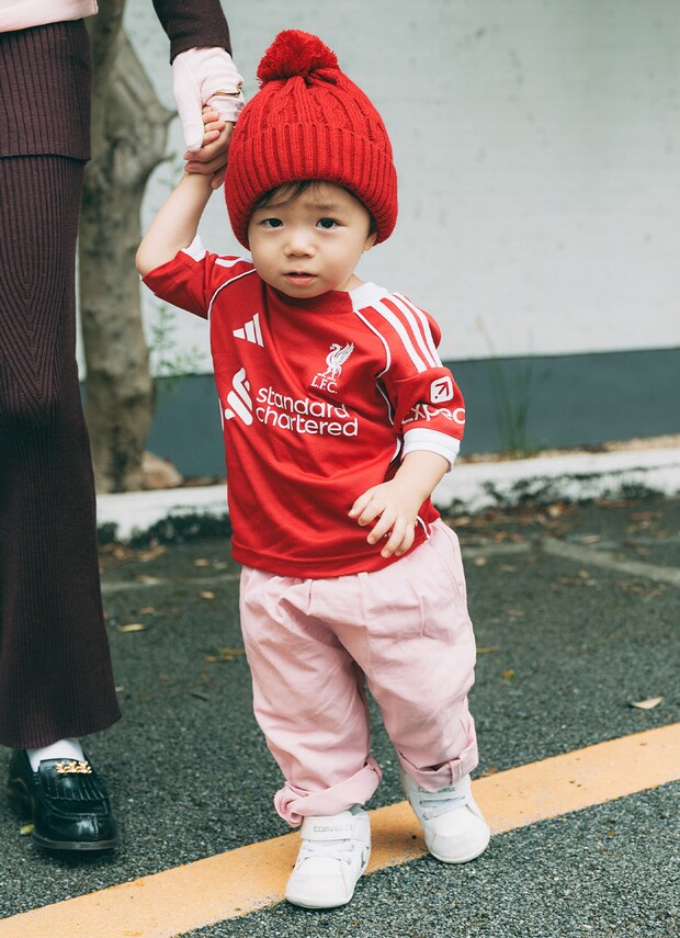 イングランドのリヴァプールFCのユニフォームにピンクのパンツを合わせて、トレンドのブロークコアを満喫中の翔平くん。トップスに合わせて真っ赤なニット帽を投入して、赤×ピンクのツートーンコーデに。足元は定番人気の『コンバース』で、元気いっぱいのスタイルが完成!
