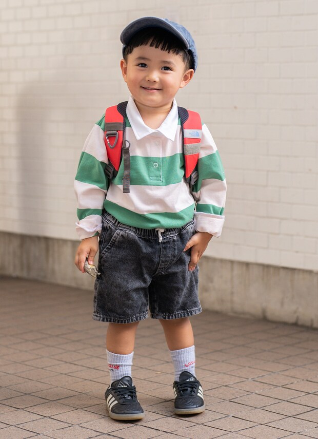 トレンドのラガーシャツに履き心地抜群のジョーツを合わせた、さくくんのカジュアルストリート。街歩きはもちろん、動きやすさもばっちりなので、公園遊びやちょっとしたアウトドアにもぴったり! ハットやリュックなど、小物使いでアクセントを効かせた、今すぐ真似したくなる着こなし。