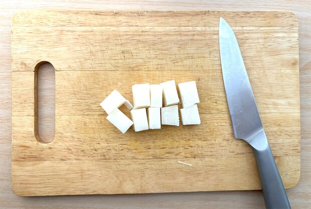 また、切り餅は電子レンジにかけて溶かす工程があるので、よく溶けるように下の画像くらいの大きさに刻んでおきます。
