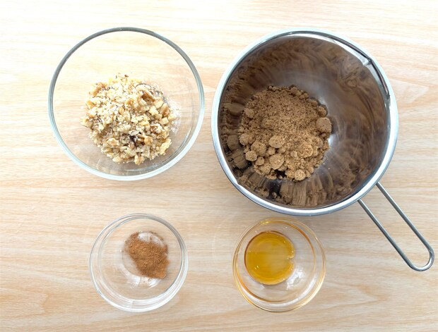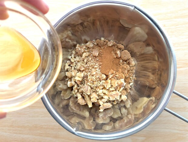 ボウルに、くるみ、黒砂糖、蜂蜜、シナモンパウダーを入れて、よく混ぜて中身の餡を作っておきます。