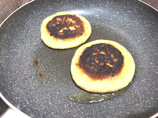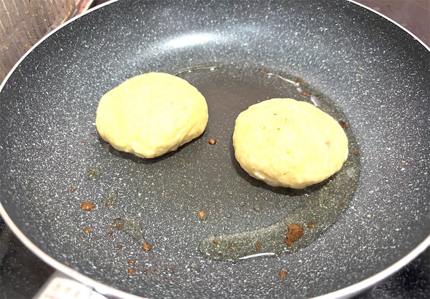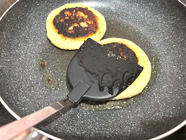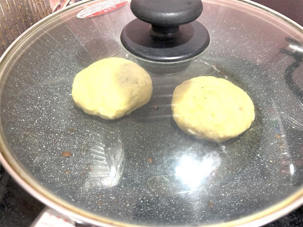 2分ほどしたらフタを取り、焼き色が付いていたらひっくり返してフライ返しで押しつぶします。