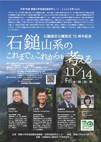 石鎚国定公園指定70周年を記念し、愛媛大学が主催する「まちなか大学vol.5」。森林・観光・居住の視点から石鎚山系の魅力と課題を語り合います。自然と人が共に歩んだ70年の歴史を振り返り、次世代への継承を考える講座。参加無料、事前申込制でオンライン配信も実施。
