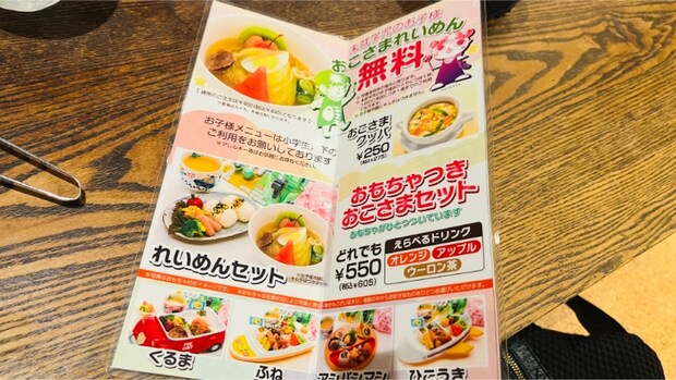 ぴょんぴょん舎は、盛岡冷麺店の中でも特にキッズメニューが充実しているのが魅力です。車や飛行機、キャラクターなど、プレートの種類がいくつもあり、子どもが選ぶ楽しさもあります。さらに未就学児の盛岡冷麺が無料という嬉しいサービスもあり、家族連れにとって利用しやすいお店です。
