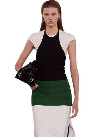 大胆なカッティングによる肌見せに抵抗があるときは、フェラガモのようにインナーにTシャツをレイヤードさせるのも◎。
