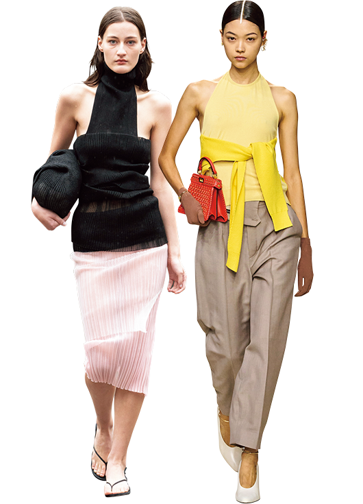 肌見せのバリエーションが増えた今、次にクローゼットに迎え入れたいのは、首元から肩にかけて大きくスクープされたアメリカンスリーブトップス。ランウェイではカットソー素材のカジュアルなものから、ハイゲージのニットで編まれたシックなものまで、幅広くラインナップ。