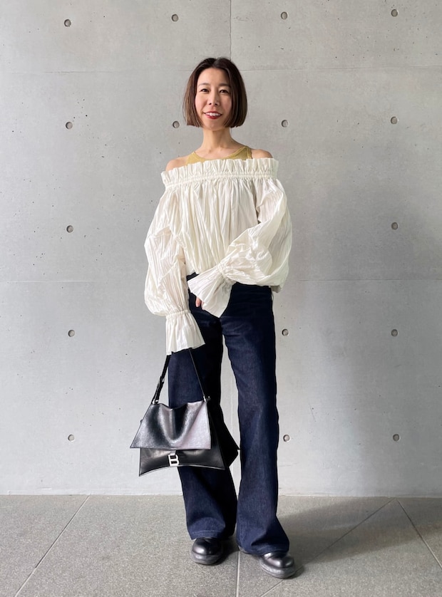 「ブラウスを旬のオフショルスタイルにして、メタリックなアメスリのニットプルオーバーを下に重ねました。ブラウスの裾を絞ってふんわりボリュームを出しているので、ボトムはすっきりとしたシルエットで邪魔にならないものを。ワッシャープリーツ加工が施された存在感のあるブラウスは着るだけでコーデの主役に」