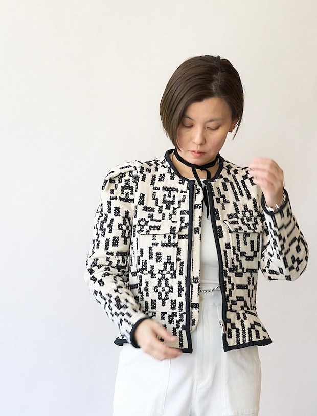「大好きなブランド、イザベル マラン エトワールの柄ジャケットを主役にしたホワイト×ブラックスタイル。ジャケットに主張があるので、シンプルにコーディネートしました。モード過ぎない程よいカジュアルが好みなので、ゆとりのあるホワイトパンツや丸みのあるシューズを合わせています」