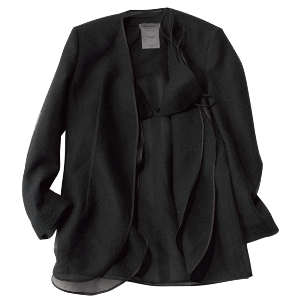 「ブラトップ、ベスト、ジャケットの3ピースは、シンプルなリブタンクに重ねて着るイメージ。それぞれバラバラに使ってもいいし、大人っぽく上品に着られる透けアイテムです」
