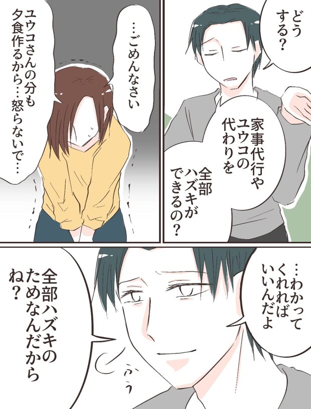 自分磨きが好きで自分にも妻のハズキさんにも妥協を許さないリヒトさんは、自分のルーティンや計画が崩れることをとても嫌がり、ハズキさんの家事に完璧を求めました。頑張っても頑張ってもダメ出しばかりされる毎日でハズキさんは次第に追い詰められていきました。リヒトさんはハズキさんが妊娠しても完璧を求め、つわりが酷くなったハズキさんが自分の希望に応えられないとわかるとハズキさんの代わりに家事をしてもらうといってユウコさんという女性を住み込みで雇いました。ユウコさんはハズキさんの入院中にリヒトさんがスポーツジムで出会った女性で、家事をしてもらっているうちに二人は男女の仲になっていました。ハズキさんが退院してからもユウコさんに家に居てほしいと考えたリヒトさんは、家事は代行サービスに任せて自分はリヒトさんの体のメンテナンスをするというユウコさんの提案を受け入れ、退院したハズキさんとリヒトさん、ユウコさんの3人の生活が始まりました。リヒトさんとユウコさんの距離の近さに違和感を覚えながらも我慢していたハズキさんは、自分が家事をできるようになればユウコさんはいなくなると思い夕食作りから家事を再開すると言ったところ、リヒトさんに「ユウコの分もお願い」と言われビックリ。ハズキさんが夕食の準備をしている間にユウコさんとストレッチをして体を整えると言うリヒトさんに我慢できず「もうユウコさんにお願いするのやめてもらえないかな?」とハズキさんは言いました。