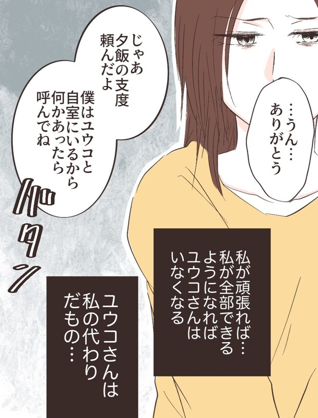「・・うん・・ありがとう」私がそう言うと、リヒトさんは「じゃあ夕飯の支度頼んだよ。僕はユウコと自室にいるから何かあったら呼んでね」と言って自分の部屋へ行きました。私が頑張れば・・私が全部できるようになればユウコさんはいなくなる。ユウコさんは私の代わりだもの・・。私はできない自分を責め、ユウコさんがいなくても困らないように頑張ろうと思いました。
