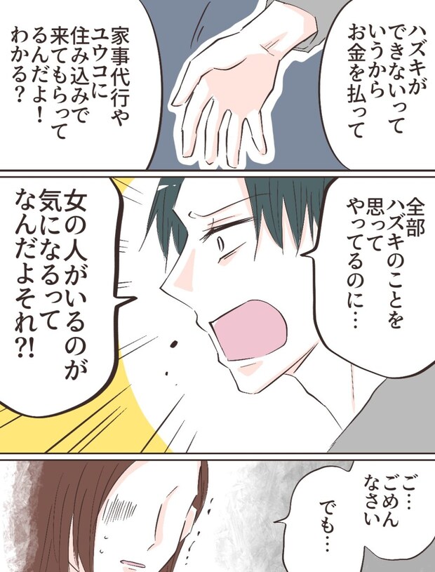 「ハズキができないっていうからお金を払って家事代行やユウコに住み込みで来てもらってるんだよ!わかる?全部ハズキのことを思ってやってるのに・・女の人がいるのが気になるってなんだよそれ?!」険しい顔でリヒトさんに責め立てられ、私は怖くなって「ご・・ごめんなさい。でも・・」と言うのがやっとでした。