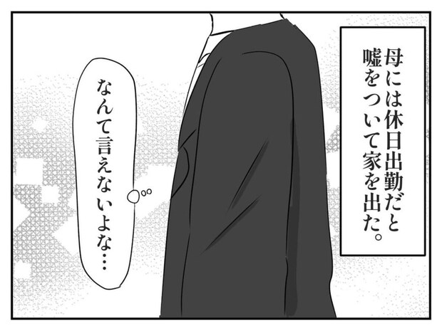 休日デートを楽しんだ二人が帰宅しようとすると、なんと目の前に母が…。どうやら息子たちのデートをずっと尾行していたようですね。休日出勤と嘘をついて家を出た息子は、会社へ行かずデートを楽しんでいたのですが…。