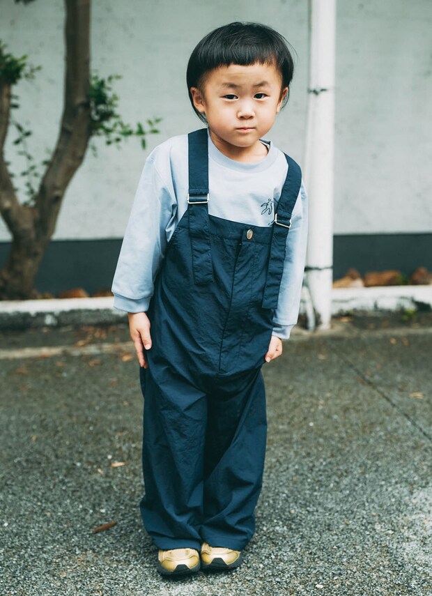 元気いっぱいなサロペットスタイルをブルートーンでまとめ。『アシックス』のスニーカーが光る挿し色にぴったりな一足。