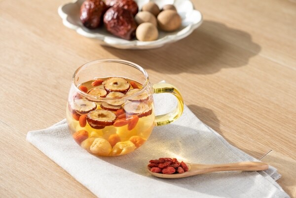 果茶には、「なつめ」「クコの実」「ろんがん」という、体の巡りをサポートする“3つの宝物”が入っている。習慣づけて飲むことで、陽だまりに包まれているような身体づくりを助ける。
