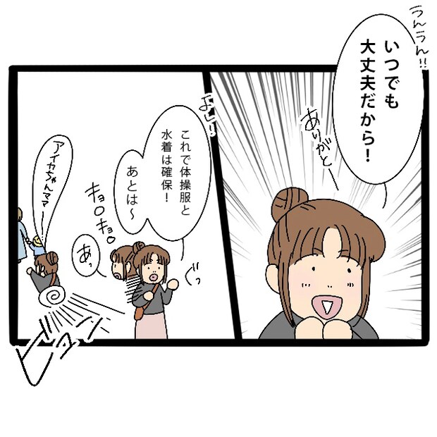「うんうん!!いつでも大丈夫だから!ありがとー」とお礼を伝えた後、「よし!これで体操服と水着は確保!あとは~」そう言って周りをキョロキョロ見回すと、「アイカちゃんママー!!」そう言って、アイカちゃんママを追いかけて行きました。
