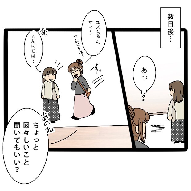 「あっ、ユズちゃんママ~。こんにちは~」と声をかけると、「あのね、ちょっと図々しいこと聞いてもいい?」とたずねました。