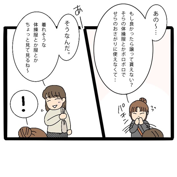 「あの~・・もし良かったら譲って貰えない?そらの体操服とかボロボロで、せらのおさがりに使えなくて・・」そう言って手を合わせると、「あー、そうなんだ。キレそうな体操服とか服とかちょっと見てみるね~」ユズちゃんママにそう言われ、