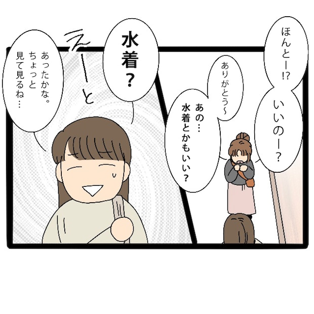 「ほんとー!?いいのー?」とうれしそうに言った後、「ありがとう~。あの・・水着とかもいい?」とさらにお願い。「水着?えーっと・・あったかな。ちょっと見てみるね・・」とユズちゃんママが困ったように言いました。