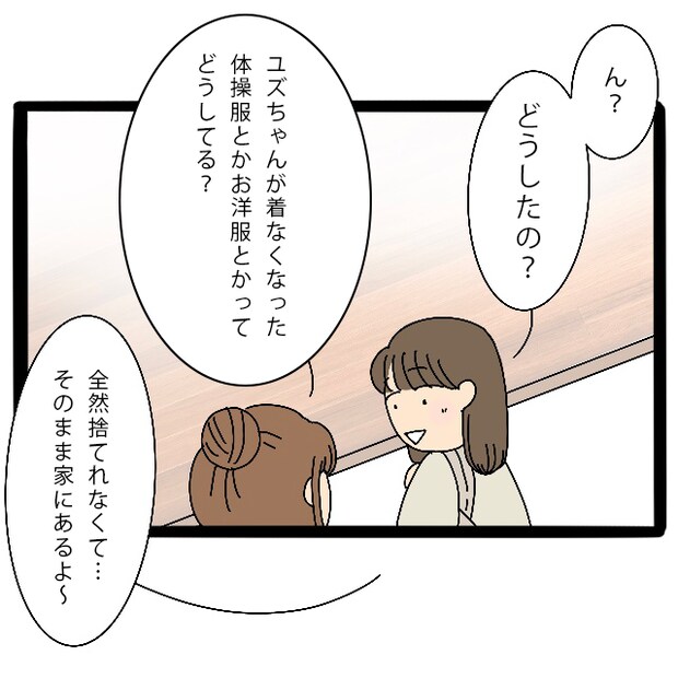 「ん?どうしたの?」ユズちゃんママがそう言い、「ユズちゃんが着なくなった体操服とかお洋服とかってどうしてる?」とたずねると、「全然捨てられなくて・・そのまま家にあるよ~」と言われました。