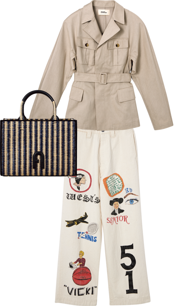 着まわし力抜群のサファリジャケットはマストバイ。ジャケット¥132,000(ミラ ショーン バイ チカ キサダ/コロネット)、パンツ¥46,200(ウエストオーバーオールズ/RHC ロンハーマン)、バッグ¥61,600(フルラ/フルラ ジャパン)