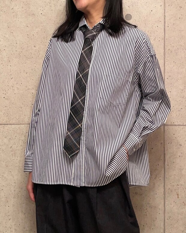 「春に欠かせないシャツ。今年はボーイズっぽいスタイルで着たくて、ネクタイ×ワイドパンツでコーディネイト。そのままだと制服っぽくなってしまうので、フェイクレザーのシャツをレイヤードしてメリハリをプラス。トレンド感のあるメタリックのシューズを合わせて遊び心を意識しました」