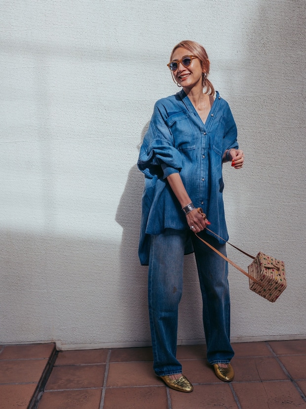 デニム×デニムで作る大人のリラックスカジュアル。「流れるようなエアリー感のデニムシャツを主役にコーディネート。デニムONデニムにマルチカラー刺繍が入ったカゴバッグを合わせて春らしいカジュアルスタイルにまとめました」