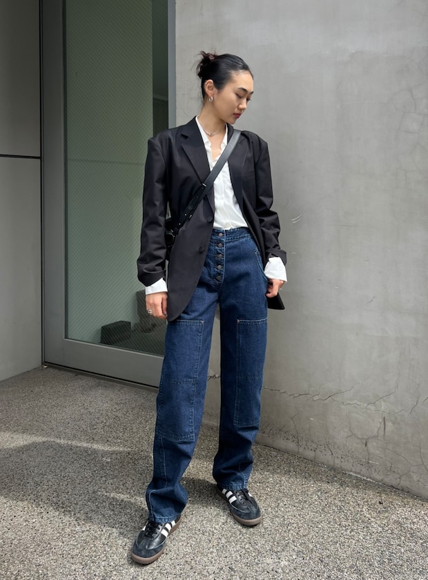 ハンサムなジャケットスタイルをシャツ×デニムでこなれた印象に。「ジャケットはビッグシルエットでどこかリラックスなムードに。スニーカーやデニムのカジュアルなアイテムを合わせて正統派なシャツにヌケ感を出しました」