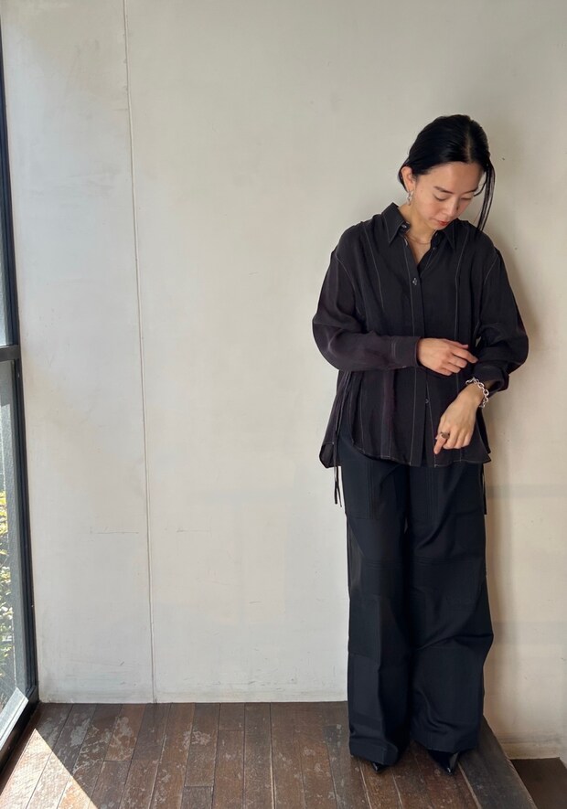 ディテールで魅せるシャツはシンプルコーデで引き立てて。「相変わらず落ち着くダークトーンコーデではありますが、ツヤ感のある素材にサイドスリットの入ったシャツで春らしさを、シルバージュエリーで女性っぽさを演出しました」