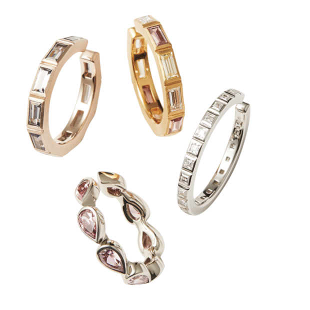 左上から時計回りに:リングカフ[SVRBG×ナノストーン]¥29,700、[SVYG×CZ]¥27,500、[SVPT×CZ]¥22,000[SVPT×CZ]¥26,400(全てete)