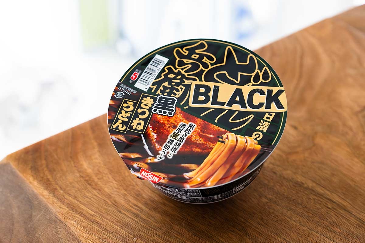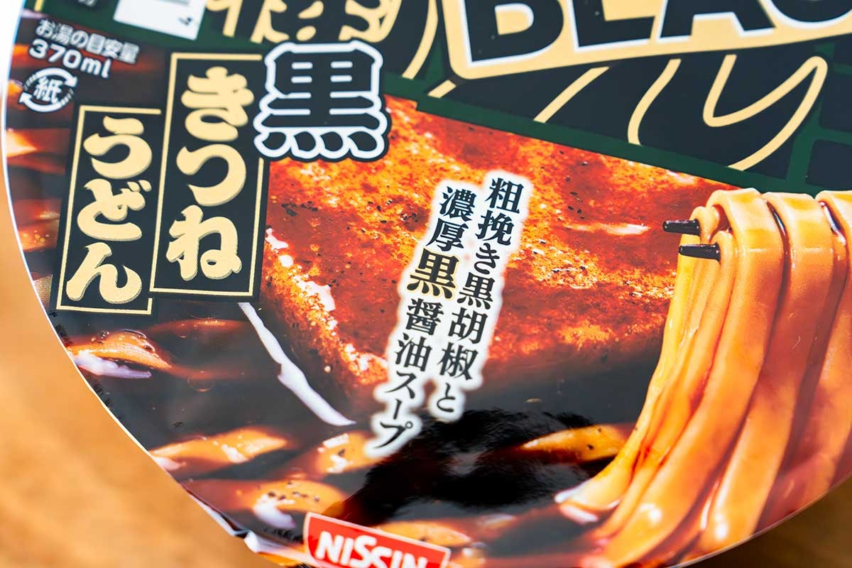 「日清のBLACKどん兵衛 黒きつねうどん 粗挽き黒胡椒と濃厚黒醤油スープ」