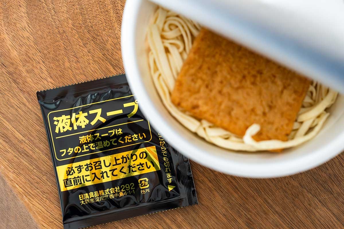 容器の中には、麺とおあげ、 液体スープが入っています。