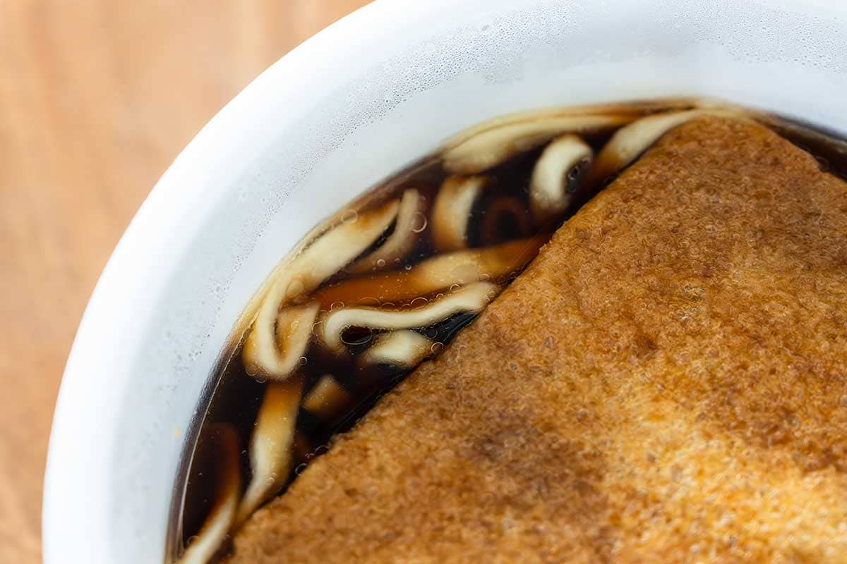 黒胡椒の香りが立ち上るスープは、鰹と鶏のだしがしっかりときいた濃厚な味わいです。でも、黒胡椒のキリッとした風味がアクセントになっているため、意外とすっきりとした飲み心地でおいしい! じゅわっとしたおあげの甘くてやさしい味わいともマッチしていますね。