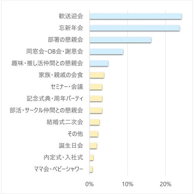 大人数で集まる目的として、歓送迎会(24.2%)や忘新年会(23.7%)が最も多く、次いで部署の懇親会(16.2%)が続く結果に。合計すると全体の70.7%を占めるこれらの企業や職場のイベントは、大人数宴会の代表的なシーンであると言える。また、同窓会(8.8%)や趣味・推し活仲間との懇親会(4.9%)など、個人的な集まりや興味・関心に基づく多様なニーズでも、10人以上の宴会やパーティが開かれていることがわかった。企業と個人の両方で、大人数宴会が楽しまれているよう。