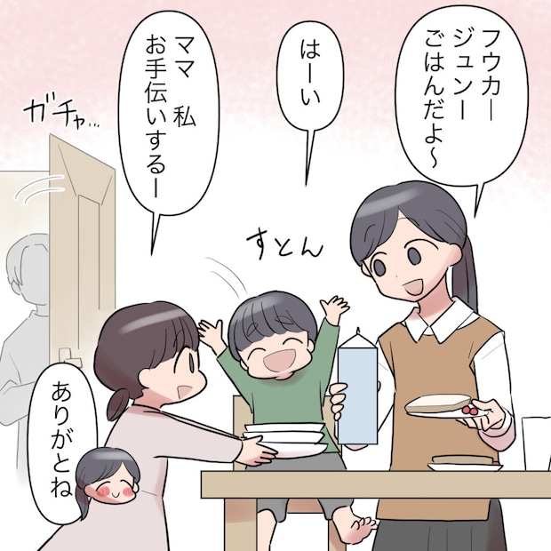 仕事の日の朝は、まず子ども達にご飯を食べさせます。2人ともちゃんとお手伝いをしてくれる子に育ってよかった!