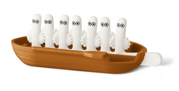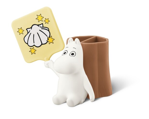 切り株の中に歯ブラシを置くことができる歯ブラシホルダー。ムーミンが持つパネルは、裏と表で2種類の貝殻の絵柄が描かれており、歯磨きができたら、パネルをひっくり返して、「できた!」をパネルで表せる。