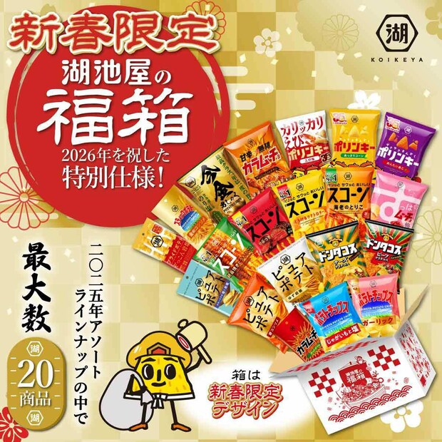 湖池屋はスナック菓子がドドンと20袋も入った特別仕様の福箱を販売します!