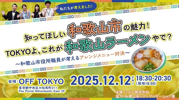 東京にこだわらない生き方“OFF TOKYO”を、全国各地の自治体・地域と連携しながら展開するシビレは、和歌山市シティプロモーション課からの受託事業として、和歌山市のご当地グルメ「和歌山ラーメン」をテーマにしたイベント「知ってほしい和歌山市の魅力!TOKYOよ、これが和歌山ラーメンやで?」を、12月12日(金)、東京都中央区のOFF TOKYO(東京本社)にて開催する。