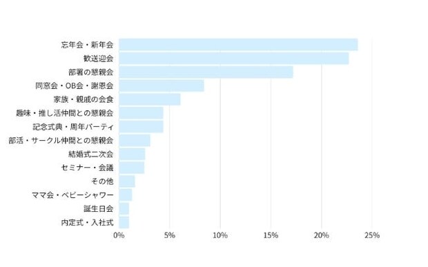 大人数で集まる目的として、忘新年会(23.6%)や歓送迎会(22.7%)が最も多く、次いで部署の懇親会(17.2%)が続く結果に。合計すると全体の63.5%を占めるこれらの企業や職場のイベントは、大人数宴会の代表的なシーンであると言える。また、同窓会(8.4%)や家族・親戚との会食(6.1%)など、プライベートな集まりでも、10人以上の宴会やパーティが開かれていることがわかった。企業と個人の両方で、大人数宴会が楽しまれているよう。