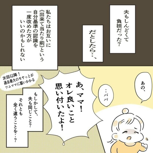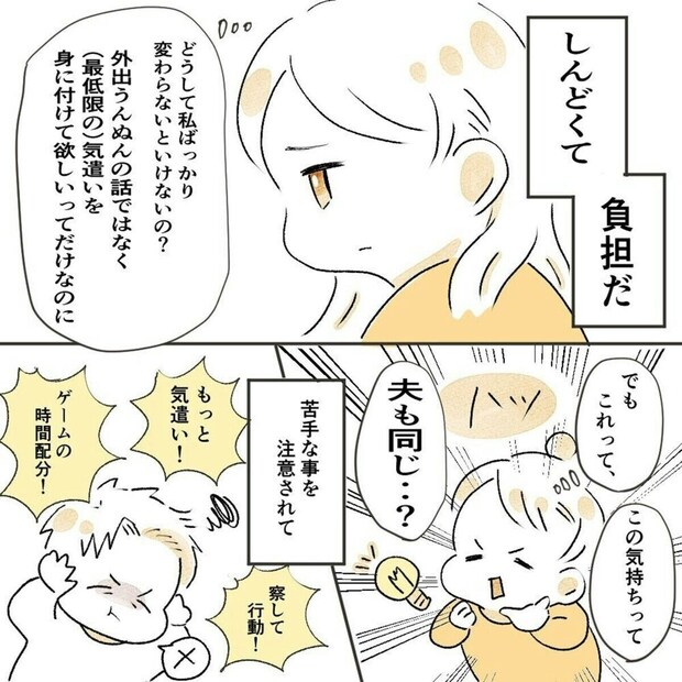 それでも、もしかしたら夫もしんどくて負担だったら?と考えなおします。さらに、できて当たり前の基準を改めたほうがいいかも、と気づきました。