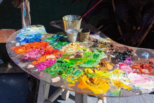 油彩画とは、顔料を乾性油(リンシードオイルなど)と混ぜて描く技法で、テンペラ画(卵黄などを結合材とする技法)に比べて乾燥が遅く、色の混ぜ合わせや重ね塗りがしやすいという特徴があります。油彩による繊細な混色の必要性が、携帯可能な木製パレットの普及を促したと考えられています。