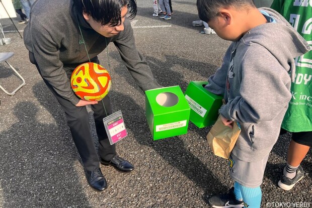 「リフティングチャレンジ」では、ランダムに引いた選手カードの背番号の数だけリフティングに挑戦。成功した参加者には特製ステッカーがプレゼントされるということで、会場は大盛り上がり!「むずかしい〜!」と叫びながらも、親子で励まし合いながらチャレンジする姿が多く見られました。うまくいった瞬間には大きな拍手が沸き起こり、会場全体が一体となって笑顔に包まれました。
