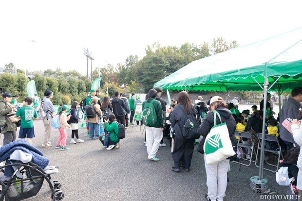 「応援フラッグワークショップ」は、開始早々から長蛇の列ができるほどの人気ぶりでした。先着250名限定ということで、子どもからシニア層まで、幅広い世代が参加。思い思いのデザインや文字で、世界にひとつだけのオリジナル応援フラッグを作りました。完成したフラッグを持ってスタジアムに向かう参加者たちの姿は、年齢を問わず東京ヴェルディを応援する気持ちがひとつになった象徴のようでした。風に揺れる手作りのフラッグが、会場全体を温かな空気で包んでいました。
