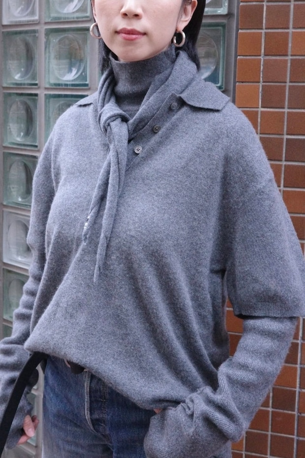 「レイヤードスタイルが楽しいエクストリーム カシミアのニットは、コレクションを『edition』という形で発表していてとくにシーズン性がないため、過去に出ていたモデルがまた出てきたりと、いつも新鮮な気持ちで着られます。コツコツ集めた新旧のニットたちをレイヤードして遊んでみましたが、同じグレートーンなのでシックにまとまりました。特にタートルネックニットは袖がびよーんと長く、アームウォーマーのようなボリュームが出るところがお気に入りです」タートルネックニット¥77,000、バンダナスカーフ¥27,500(共にエクストリーム カシミア/エスケーパーズオンライン)、エクストリーム カシミアの半袖ポロニットは本人私物