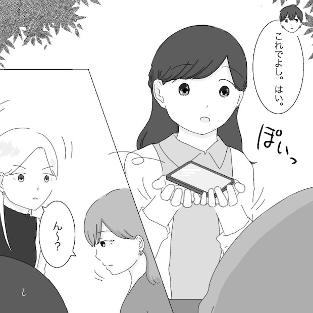 レンさんが性懲りもなくミカさんを都合よく利用しようとしているのを見て、アツシさんはミカさんのスマホを手に取ると、自分とミカさんのツーショット写真を添付して「私、アツシと付き合ったから。もう連絡してこないで!」とレンさんに送りました。カナコさんとモカさんに冷やかされアツシさんは照れくさそうにしながらも「嫌なことがあったら連絡して。力になりたいから」と優しい笑顔をミカさんに向け、ミカさんも思わず赤面。アツシさんの送ってくれたメールのおかげか、その後レンさんからミカさんに連絡が来ることはありませんでした。