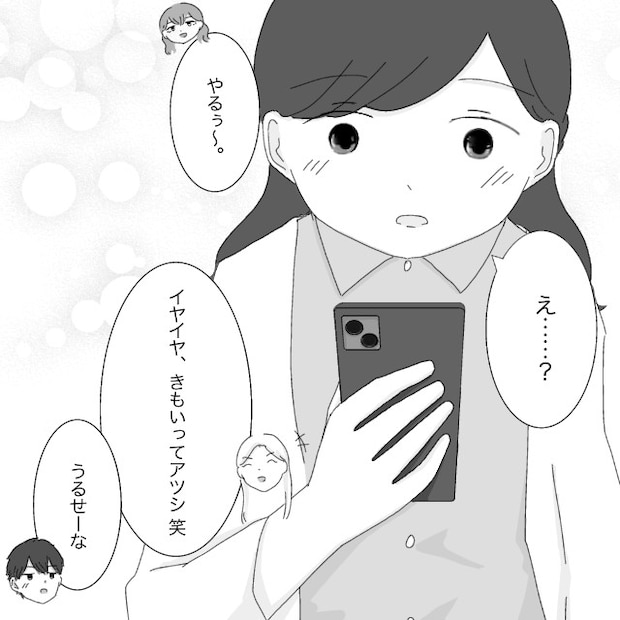 スマホの画面を見て、ようやくアツシくんが何をしていたのか理解した私。「え・・?」と戸惑っていると、モカとカナコが「やるぅ~」「イヤイヤ、きもいってアツシ笑」と笑顔で言い、「うるせーな」と照れながら言うアツシくん。