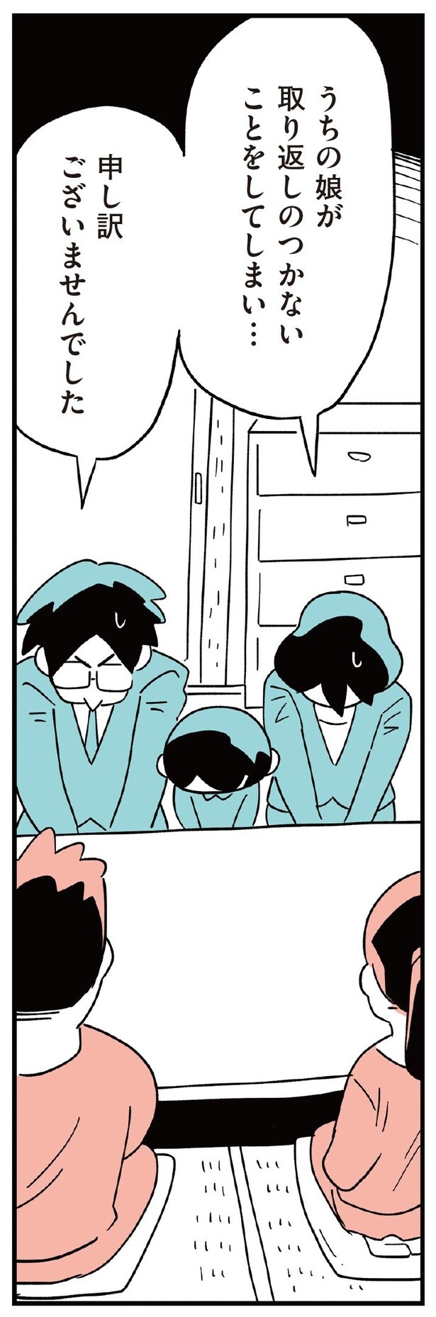 前回、いじめ加害者になった娘への憎悪と、親としての責務の板挟みになってしまった加奈子。夫、そして愛と共に、馬場家へ“加害者の親”として謝罪に赴くが…。