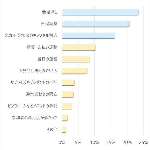 大人数が収容可能な「会場探し(23.4%)」、まず最初に行うべき「日程調整(20.7%)」、急な不参加者の「キャンセル対応(16.2%)」と、宴会当日までの調整が大変だった仕事の上位を占めた。それ以外にも通常業務と同時に、当日の運営や支払いまで、多岐にわたるタスクこなさなければならない幹事役。会場や参加者とのコミュニケーションをはじめ、幹事には次のようなマルチ能力が必要と考えられる。