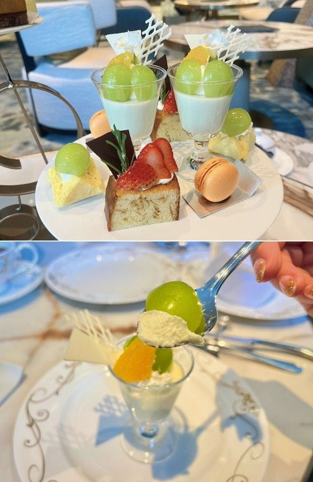繊細に飾られたホワイトチョコレートは、ミルキーな甘さが、シャインマスカットの上品な爽やかさを引き立てていました。また、添えられたオレンジの酸味が、全体の甘さをほどよく引き締めています。シャインマスカットを色々な食べ方で楽しめる、欲張りなスイーツでした。