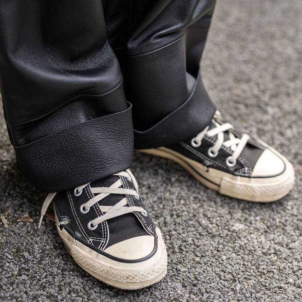 レザーボトムスと『コンバース』のスニーカーがつくるコントラストがおしゃれ。秋らしい重厚感がありながらも、カジュアルダウンさせたのはお見事!