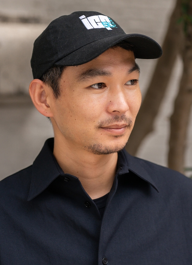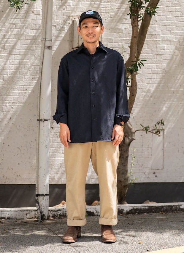 ヴィンテージのキャップを被って、ほどよく肩の抜けたシャツスタイルの完成! ブラックをシェアして、統一感を出したのがポイント。